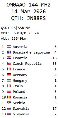 Priemerná vzdialenosť na jedno spojenie dosiahla približne 245 kilometrov, čo pri celkovom počte 96 QSO a absencii výrazných tropo podmienok je myslím dobrá. Potešilo najmä 28 násobičov a spoľahlivé fungovanie techniky.